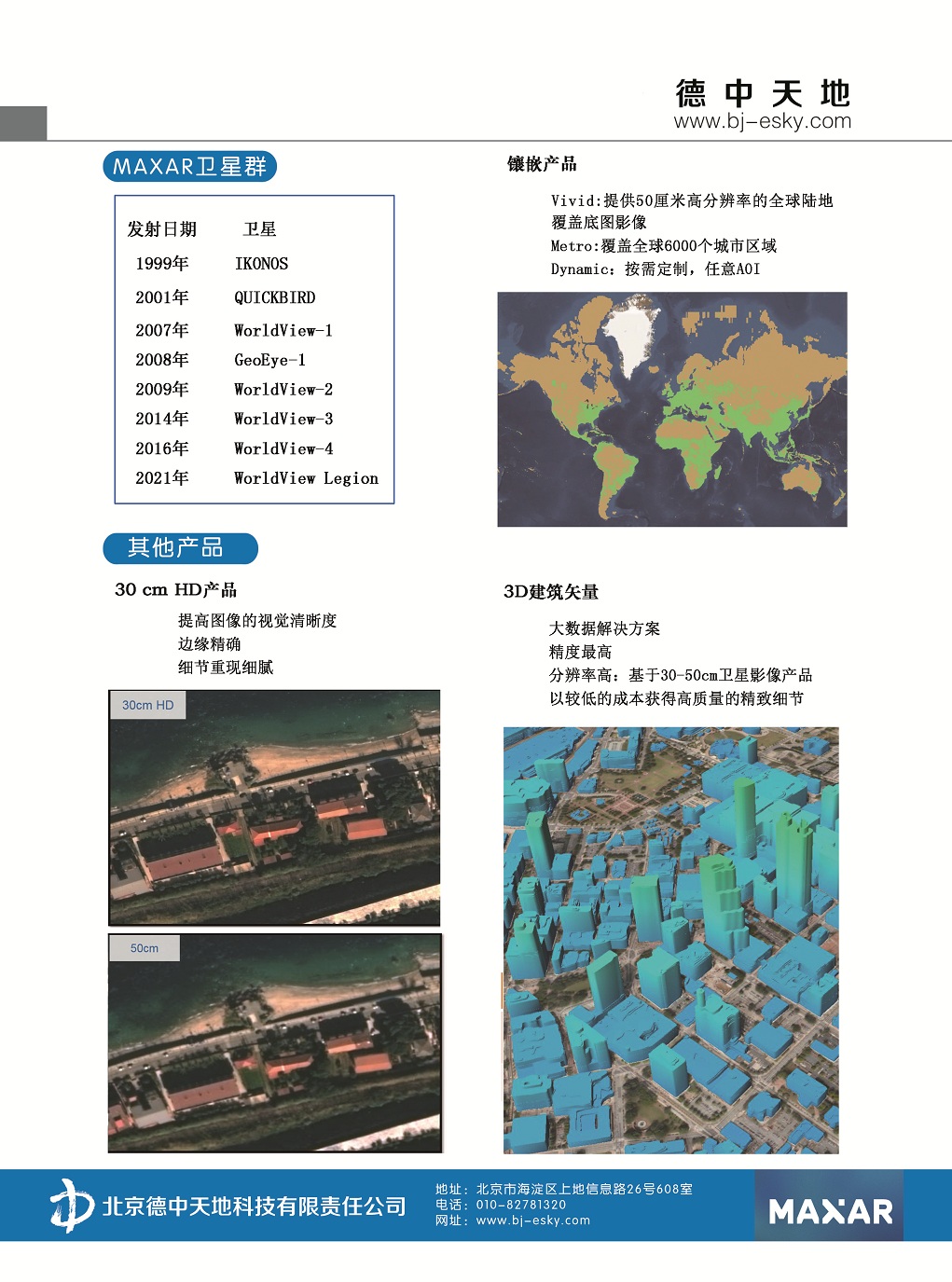 德中天地公司為MAXAR的中國(guó)代理商。MAXAR公司集成了4家相關(guān)公司,包括DigitalGlobe公司、MDA公司、SSL公司和Radiant公司,通過(guò)提供集成的太空解決方案來(lái)解決客戶最復(fù)雜的難題,是全球太空行業(yè)的領(lǐng)先者,擁有世界領(lǐng)先的技術(shù)和能力。目前已經(jīng)成功發(fā)射了7顆光學(xué)衛(wèi)星,數(shù)據(jù)覆蓋全球,涵蓋了全色、多光譜、近紅外等多個(gè)波段。除了提供基礎(chǔ)的衛(wèi)星影像數(shù)據(jù),通過(guò)創(chuàng)新技術(shù),提供高清產(chǎn)品、鑲嵌底圖產(chǎn)品、3D產(chǎn)品、矢量數(shù)據(jù)產(chǎn)品等,應(yīng)用范圍極廣。